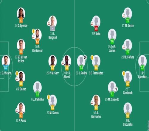 切尔西首发:1-桑切斯、27-古斯托(78'45-拉维亚)、29-福法纳(89'4-阿达拉比奥约)、23-查洛巴、3-库库雷利亚、24-里斯-詹姆斯、25-凯塞多、8-恩佐、7-内托(85'41-埃斯特旺)、49-加纳乔(66'43-吉滕斯)、20-若昂-佩德罗