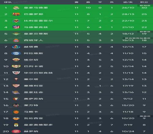 西甲第11轮结束了所有比赛,最新积分榜如下!