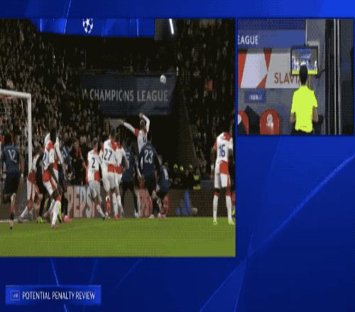 第30分钟,索博斯洛伊起脚射门,皮球先是打在琼阿梅尼的膝盖上,反弹到了手臂上,VAR介入,裁判确定没有点球。