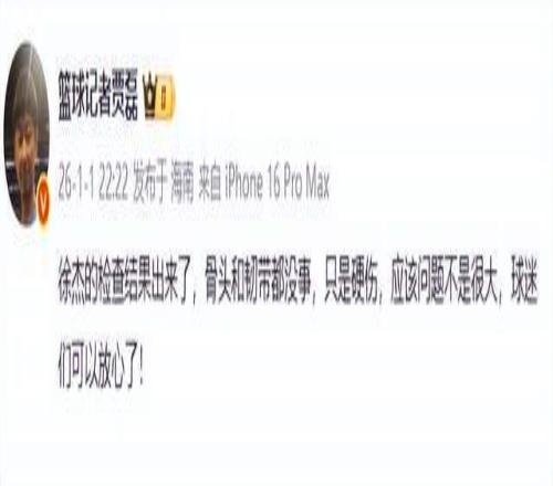 而徐杰表情痛苦无法行走的画面,令人揪心。赛后,杜锋表示徐杰已经去拍片检查去了。随后,北京篮球记者贾磊在社交平台给出徐杰伤情,“徐杰的检查结果出来了,骨头和韧带都没事,只是硬伤,应该问题不是很大,球迷们可以放心了!