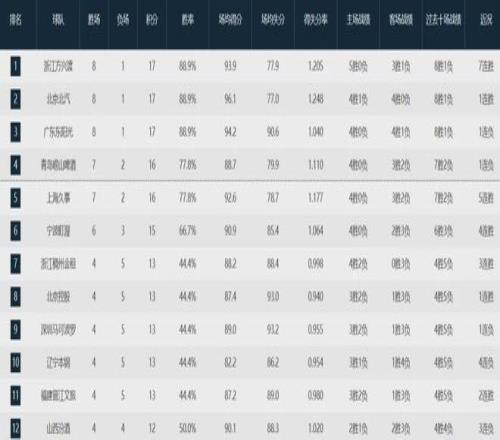 目前为止,卫冕冠军广厦队8胜1负高居联盟榜首,北京队同样8胜1负紧随其后,广东队也是8胜1负位列第三,青岛队7胜2负第四,上海队7胜2负第五......