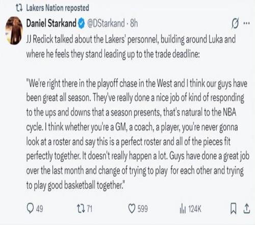 八村垒在赛后的采访中也这样说道:雷迪克说我们现在这套阵容已经足够打进季后赛。只要我们的球队能够稳定的配合,我们就能取得进步。(从这个角度来看湖人大概率在交易截止日前真的没有任何运作了)